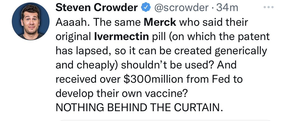 Sell ivermectin at 50 a pill your number not mine for several years while the trials are ongoing and the FDA is in the approval process and then any number of years later if it becomes approved switch to the new product for 20 a pill again your number not mine. 4 Merck Statement on Ivermectin use During the COVID-19 Pandemic University of Minnesota Medical School May 25 U of M Medical School receives 15M. Just another data point in favor of Ivermectin.